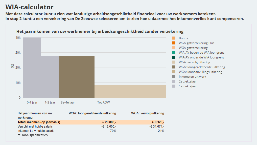 Voor elk percentage arbeidsongeschiktheid bestaat weer een andere WIA-werknemersverzekering. Hieronder vindt u ons aanbod. U kiest zelf welke zekerheid u uw werknemers biedt. Daarbij kunt u de verzekeringen ook combineren.